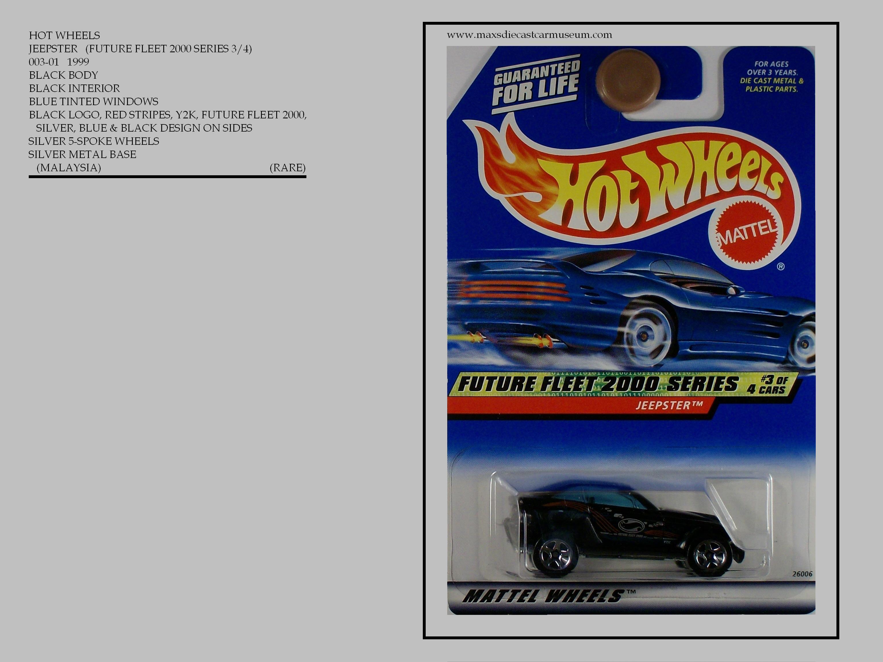 For the year 2000 release Mattel ended a number series that ran for ten years and restarted the series at number one. The years releases were still made up of Mini Series within the number series. Although the 2000 series do not have as large of range of variations as previous years, many do exist and can be the differance between rare and not. The #3 JEEPSTER with unpainted base is rare.