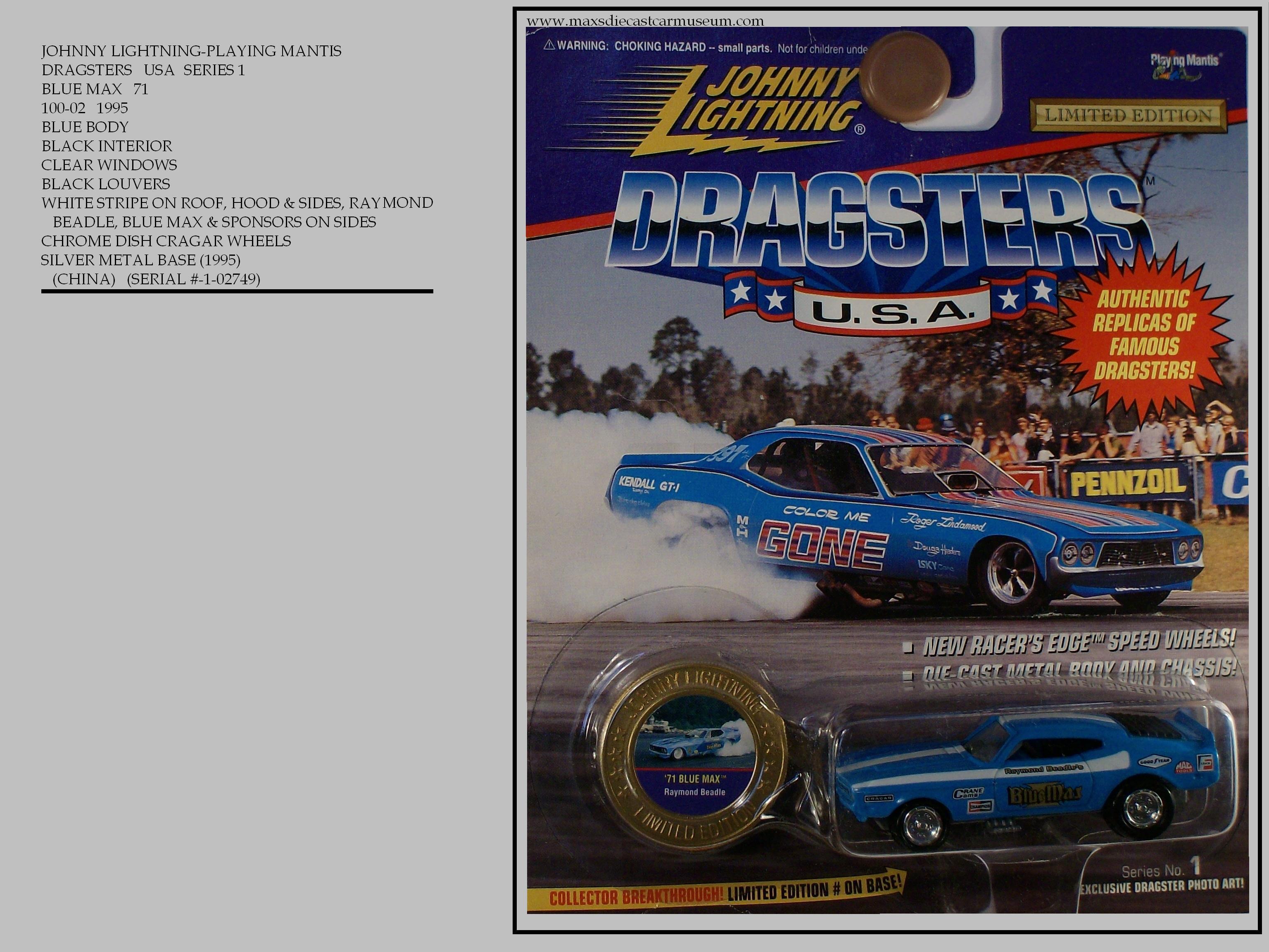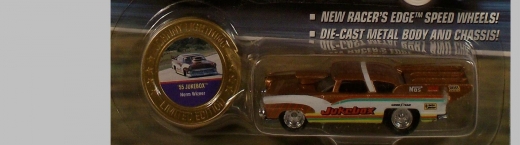 In 1995, In addition to the second Commemorative Challengers release, Johnny Lightning released the dragsters USA Line, an eleven car collection of drag racers. Variations were divided into numeric series, including a change in which car was on the card. New to the Johnny Lightning production process, The Dragsters USA series offered the limited edition number on the base. A wecome addition to the joy of collecting. Number 315 on the 55 JUKEBOX in series 3 is reasonably low.