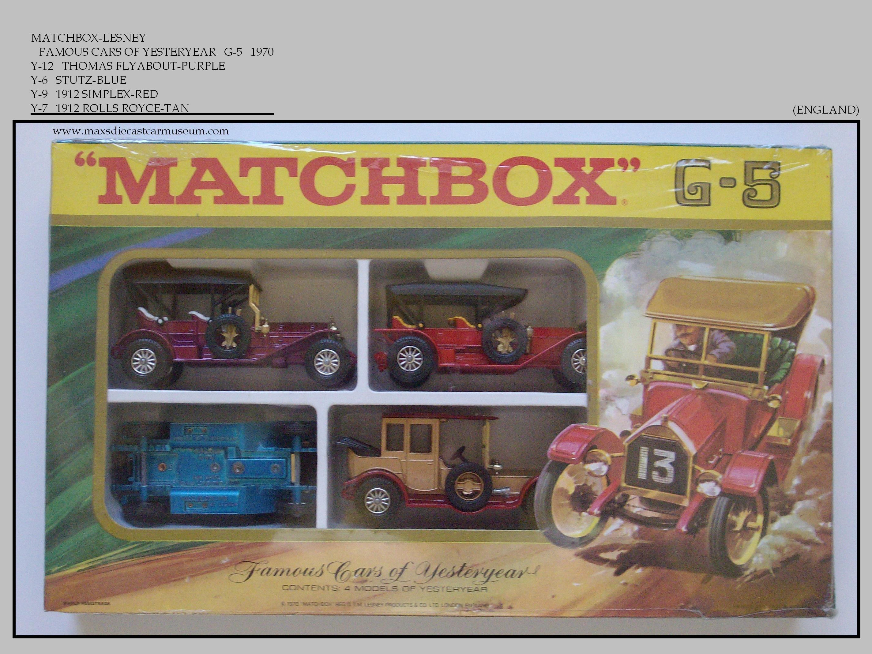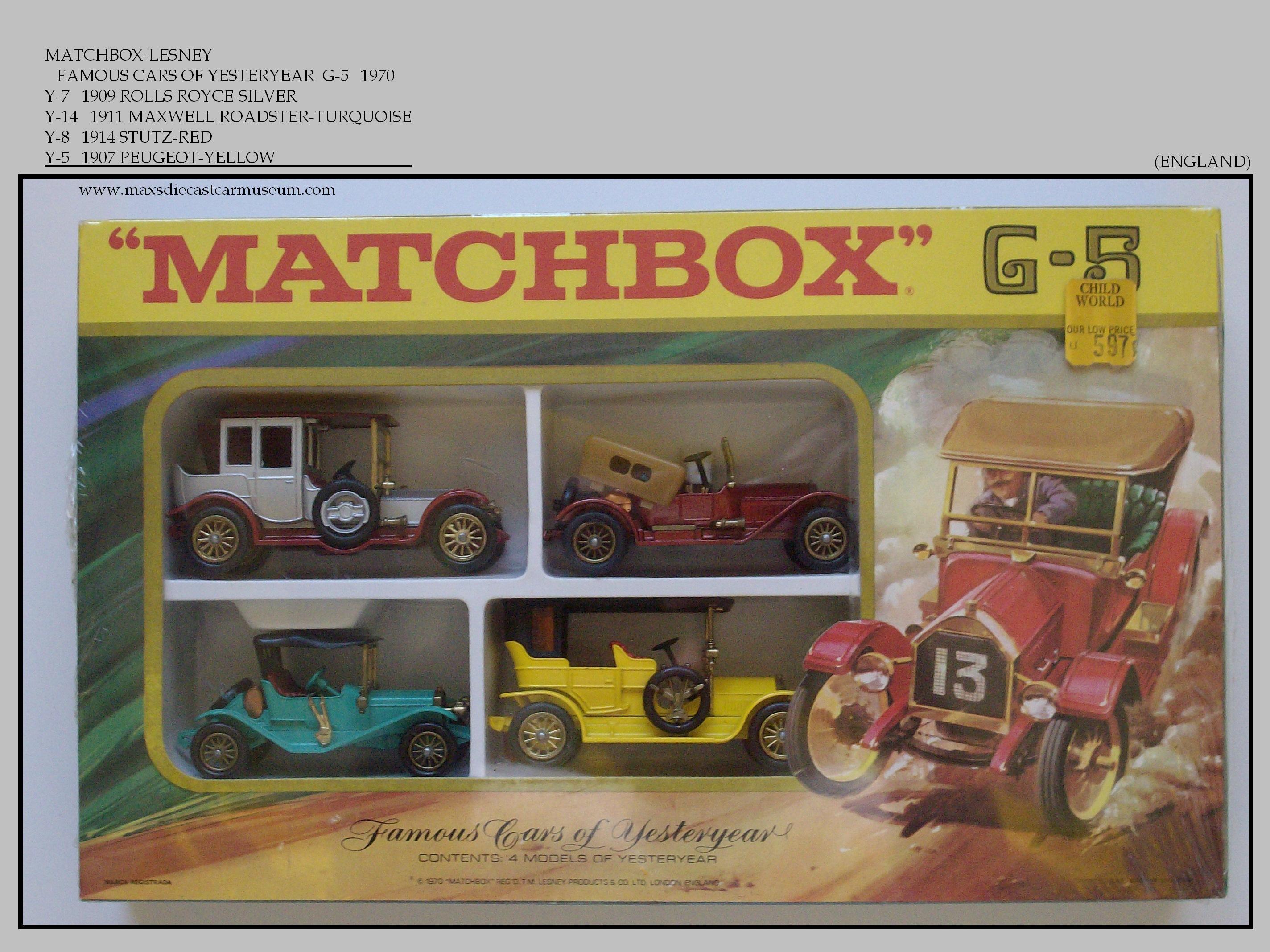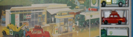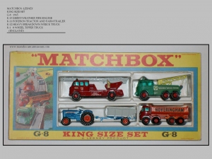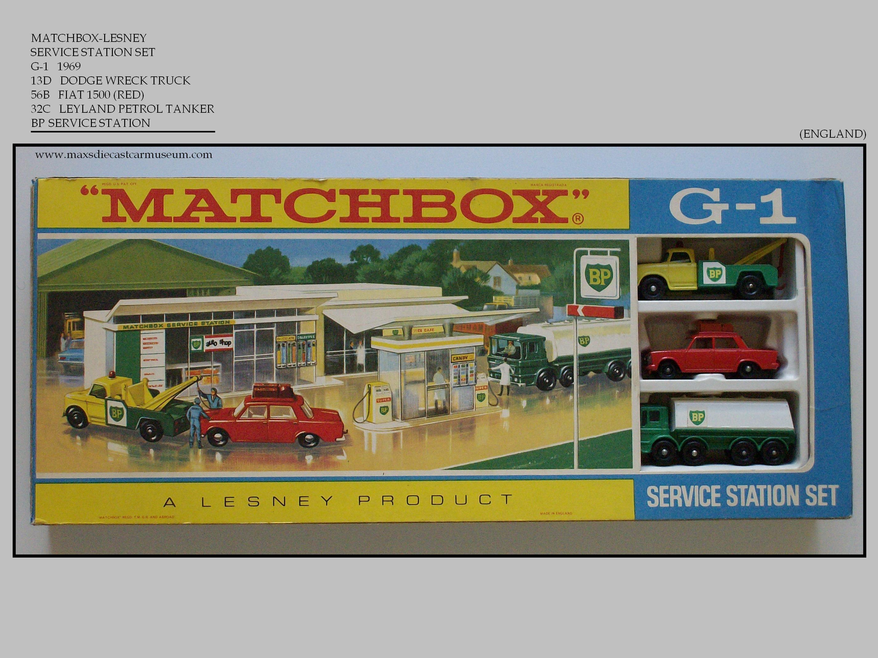 Between the mid 1950's and 1970 LESNEY produced over fifty GIFT SETS. While most only included cars, some included stations. The 1968 and 1969 G1 SERVICE STATION SET had many changes to the scene on the box between the two. One of the changes is the 1968 release has the red FIAT 1500 in the towed position, The 1969 release has it in the dropped position. The red FIAT 1500 was only released as part of the G1 set.