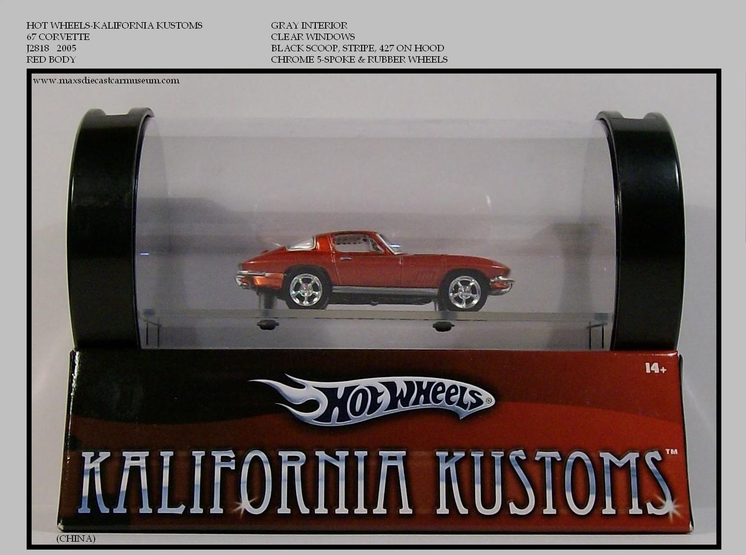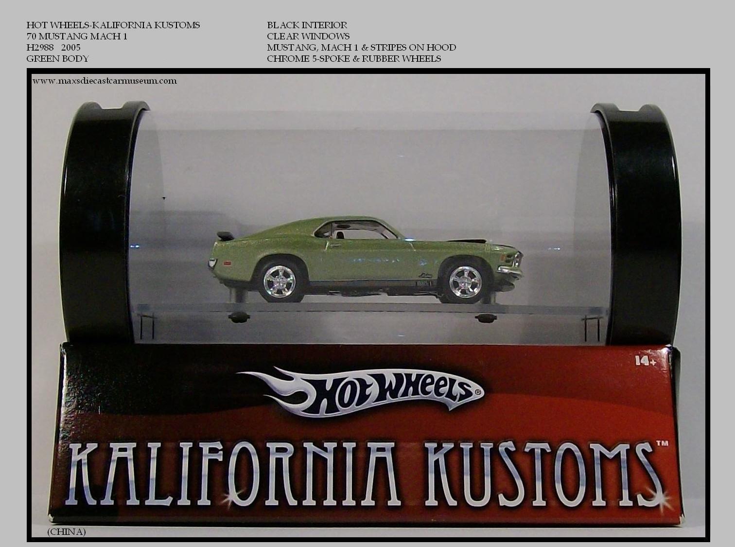 In 1990 MATTEL released the CALIFORNIA CUSTOMS. Inspired by the highly publicized West Coast Customized Car trend. This release included Dish Style Mag Wheels and a Button. The 2005 release, now named KALIFORNIA KUSTOMS has seen major upgrades, including Cragar Stle Mag Wheels, Rubber Tires and mounted in a plastic tube shaped display. This release retailed at ten times that of the basic line cars. The 1967 SHELBY GT-500 has solid Dish Type Mag Wheels.