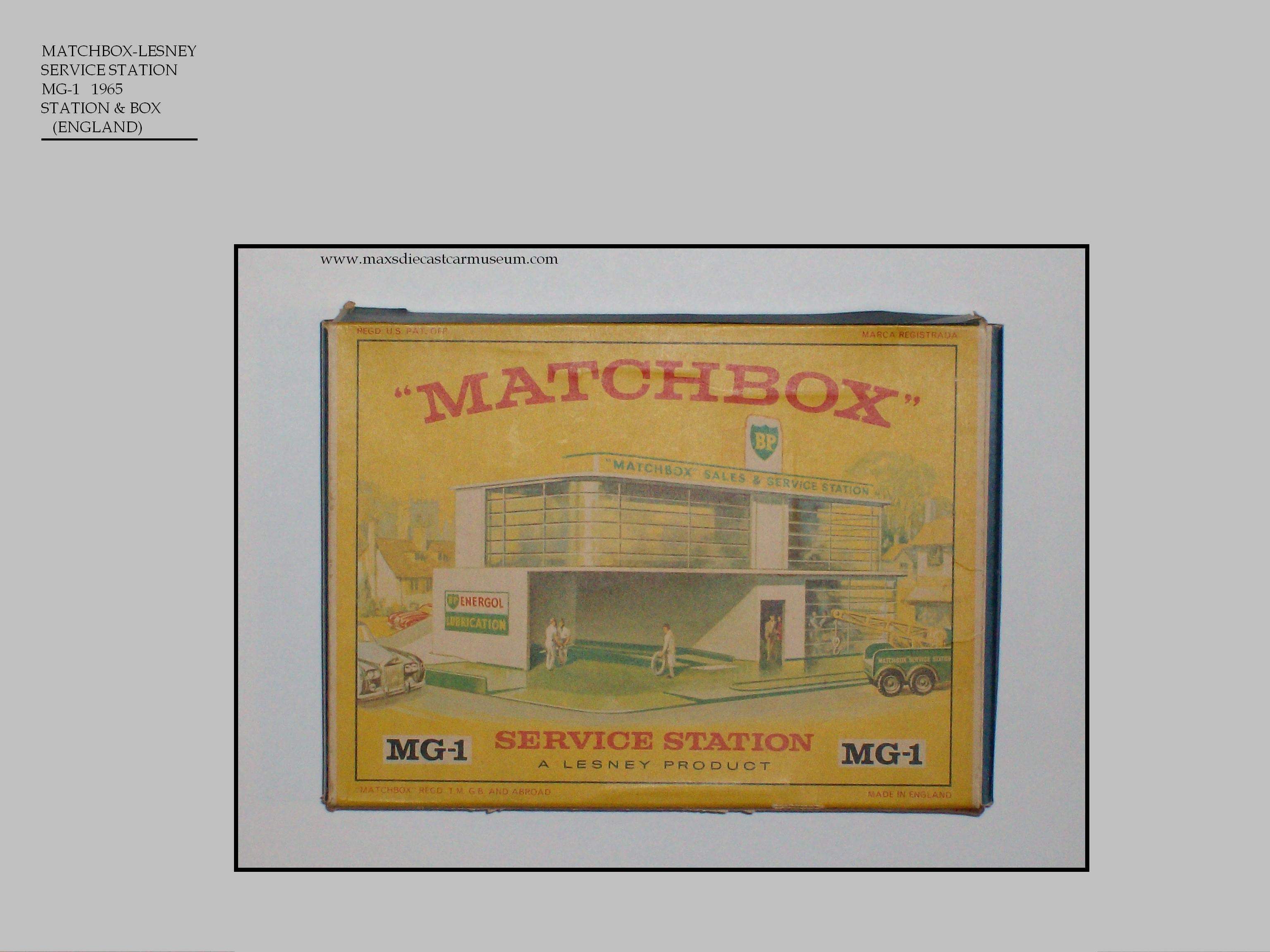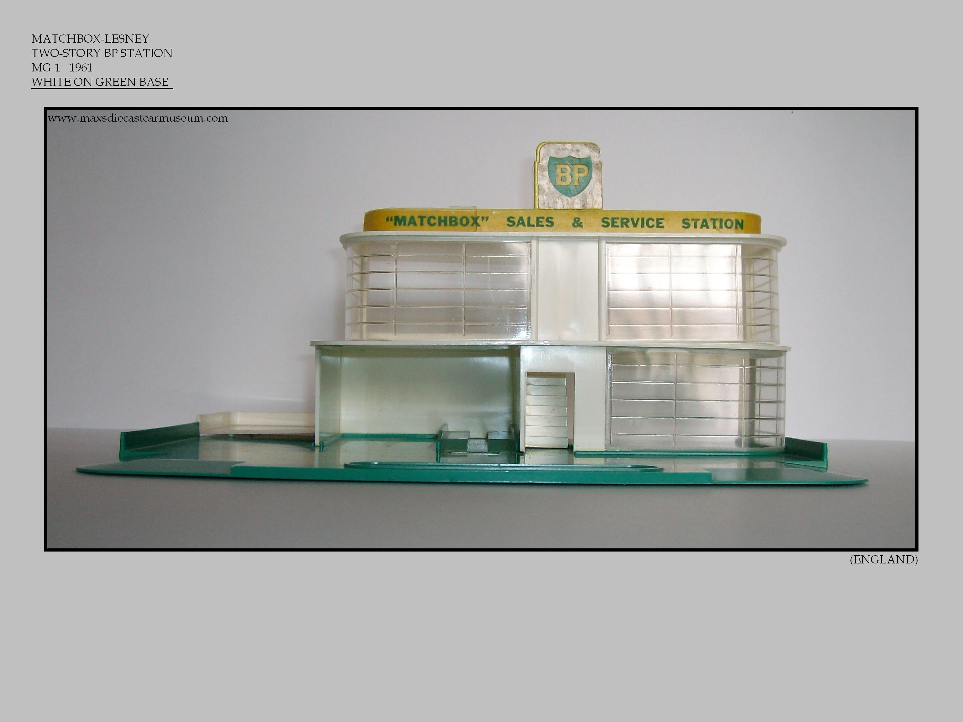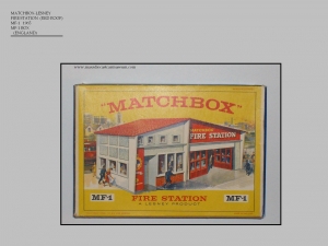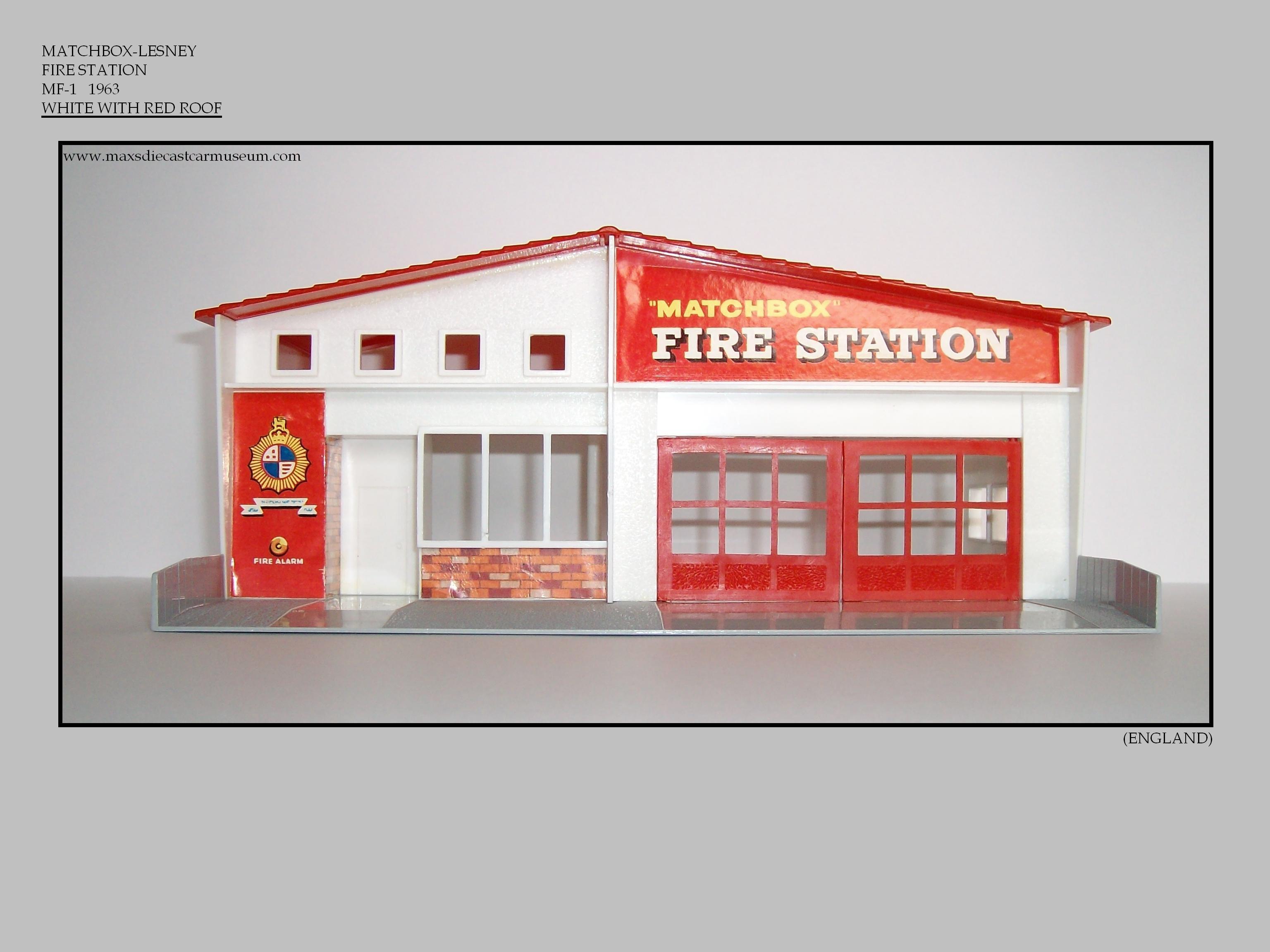 The early single-story MATCHBOX GARAGE can be found in ulternating colors, Red Building-Yellow base or Yellow Building-Red Base. The two-story SERVICE STATION has a Yellow Building-Red Base for the ESSO STATION and a White or Cream Building-Green Base for the BP STATION. Several variations can be found on the FIRE STATIONS including Rock Walls, Brick Walls, Siding and Smooth Walls with Shields, Red Roofs and Green Roofs.