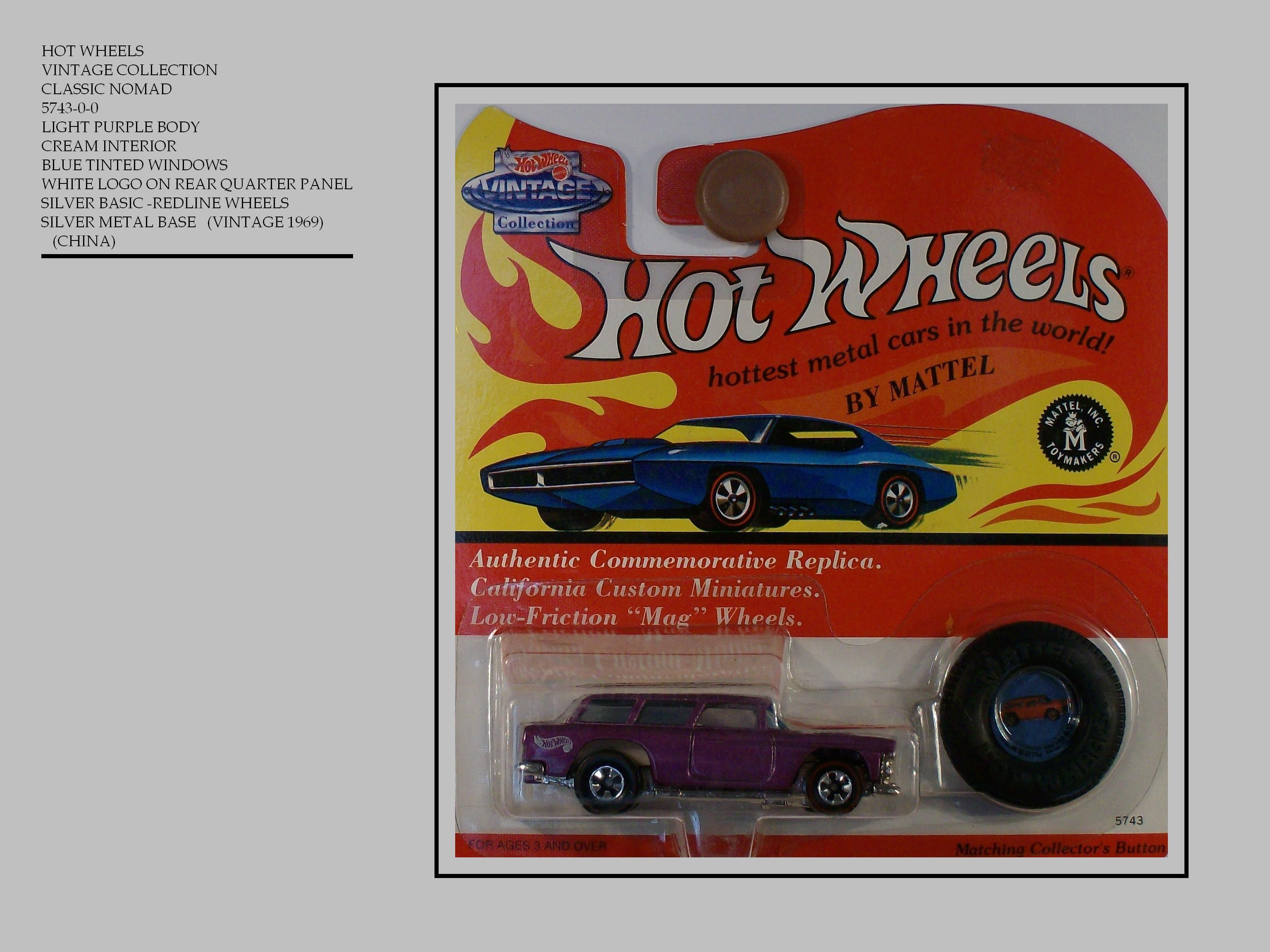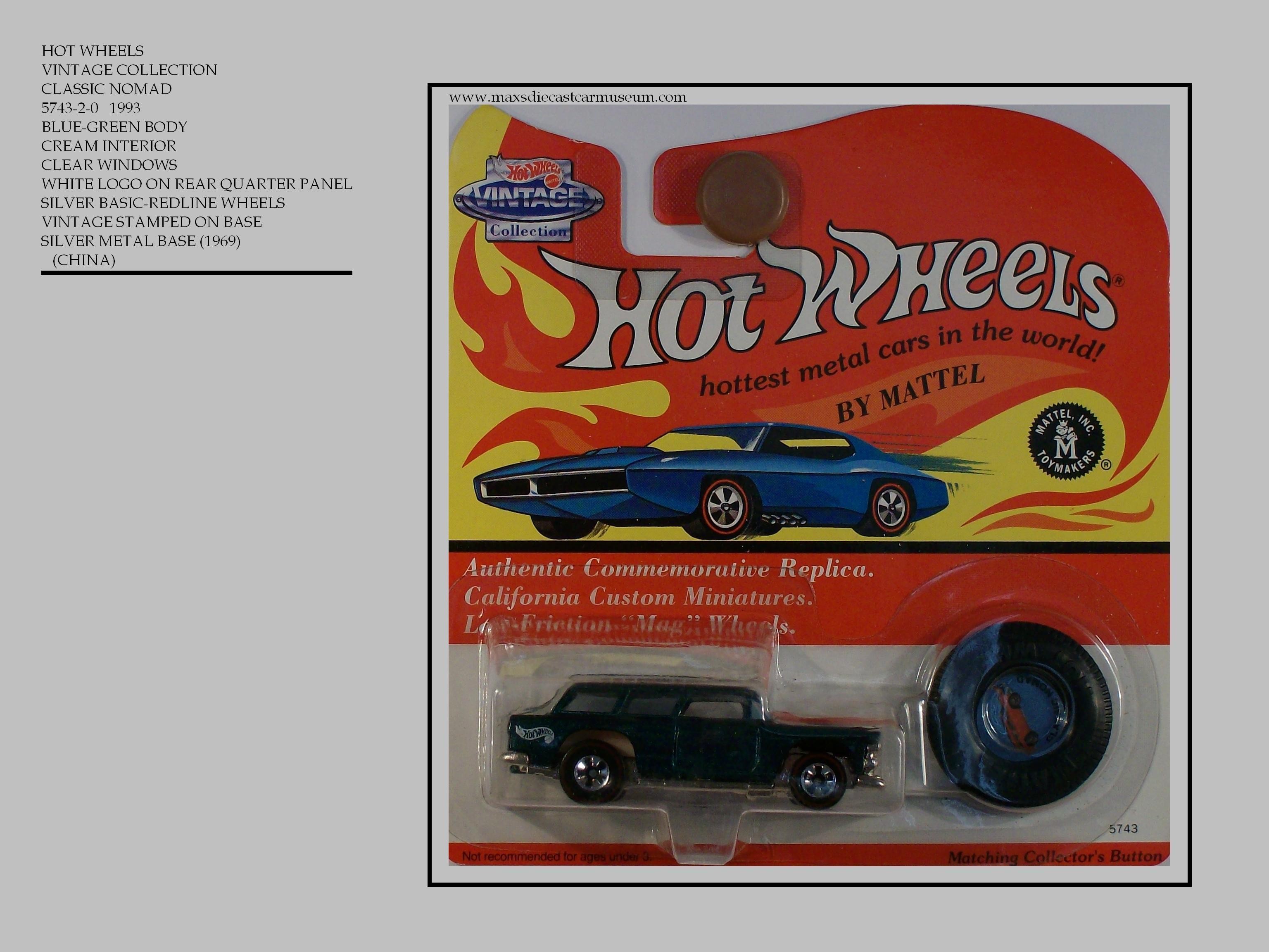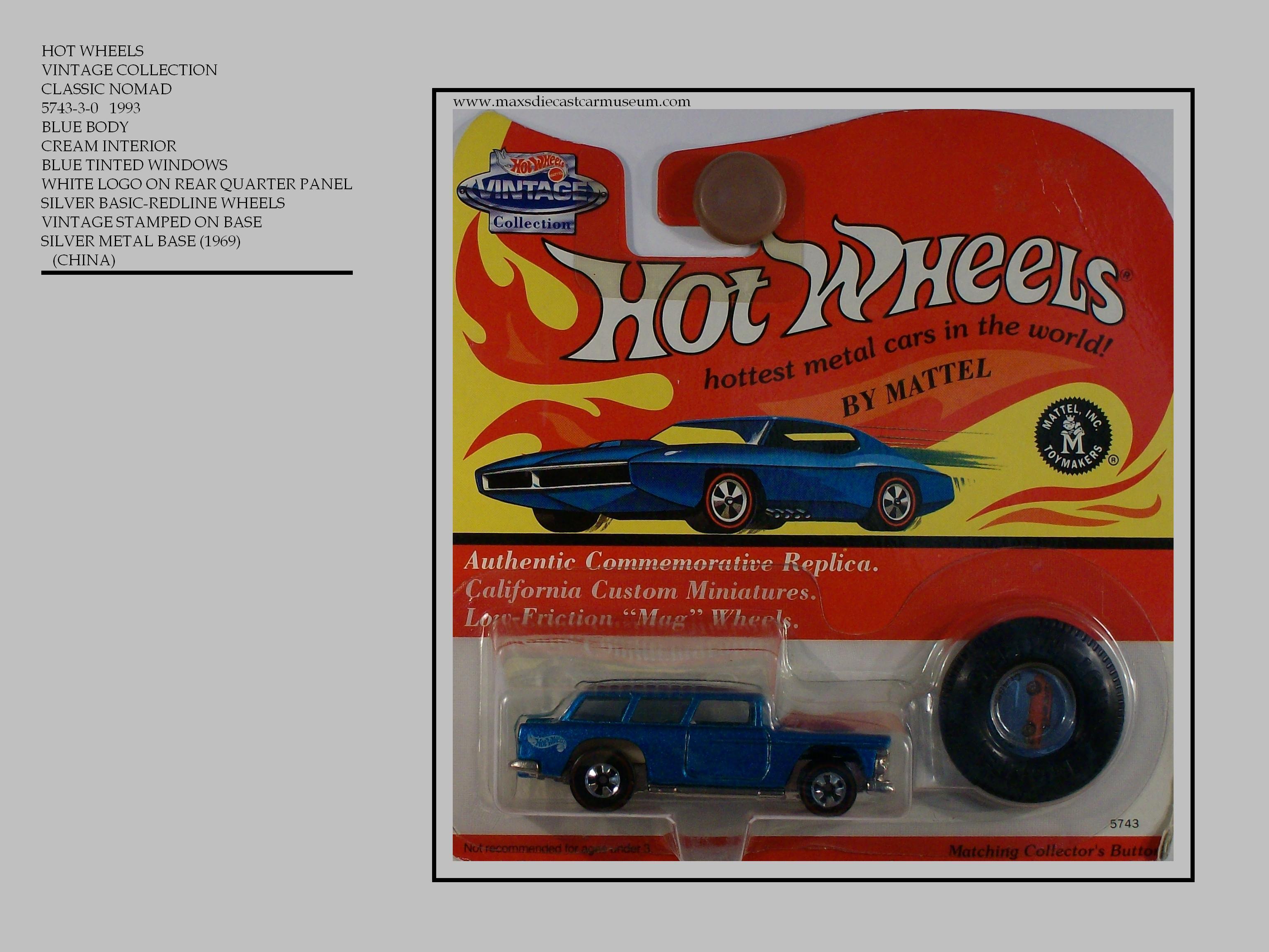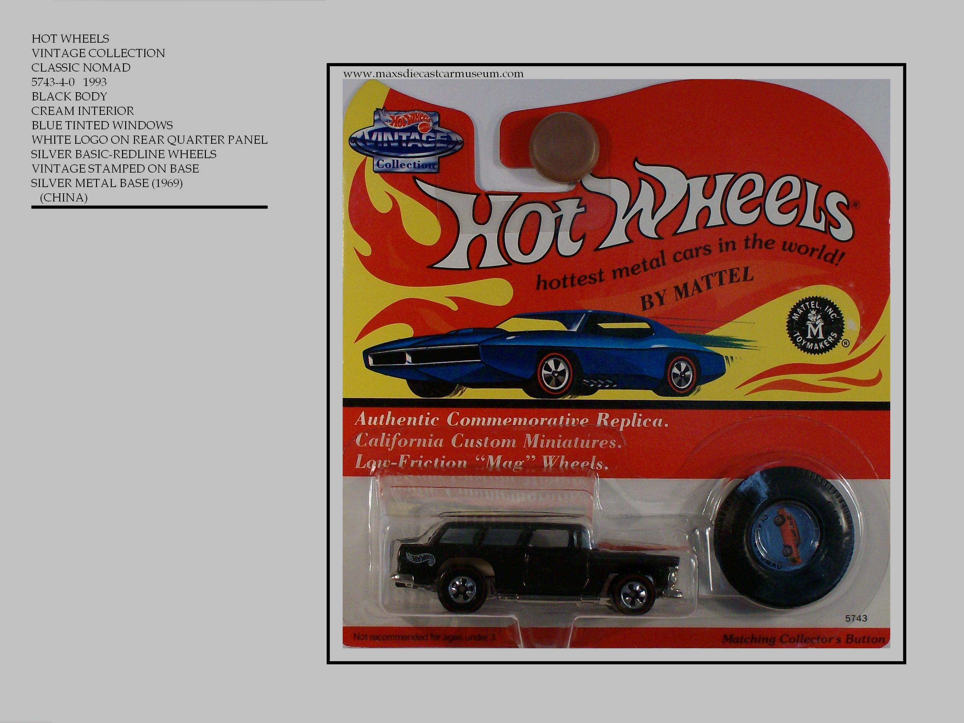 The VINTAGE collection is much like the 25th. ANNIVERSAY series in it's design. Differences in the Vintage collection from the 25th. Anniversary series include, a Hot Wheels logo somewhere on the car, Vintage on the card and Vintage stamped on the base. The Vintage collection offered a second eight car release as series 2, totaling sixteen cars for the series. The Vintage collection included cars that appeared in the 25th. Anniversary series such as the CLASSIC NOMAD. First released in 1970, the Classic Nomad has been one of the most popular and one of the most produced models of all, offering an enormious number of variations.