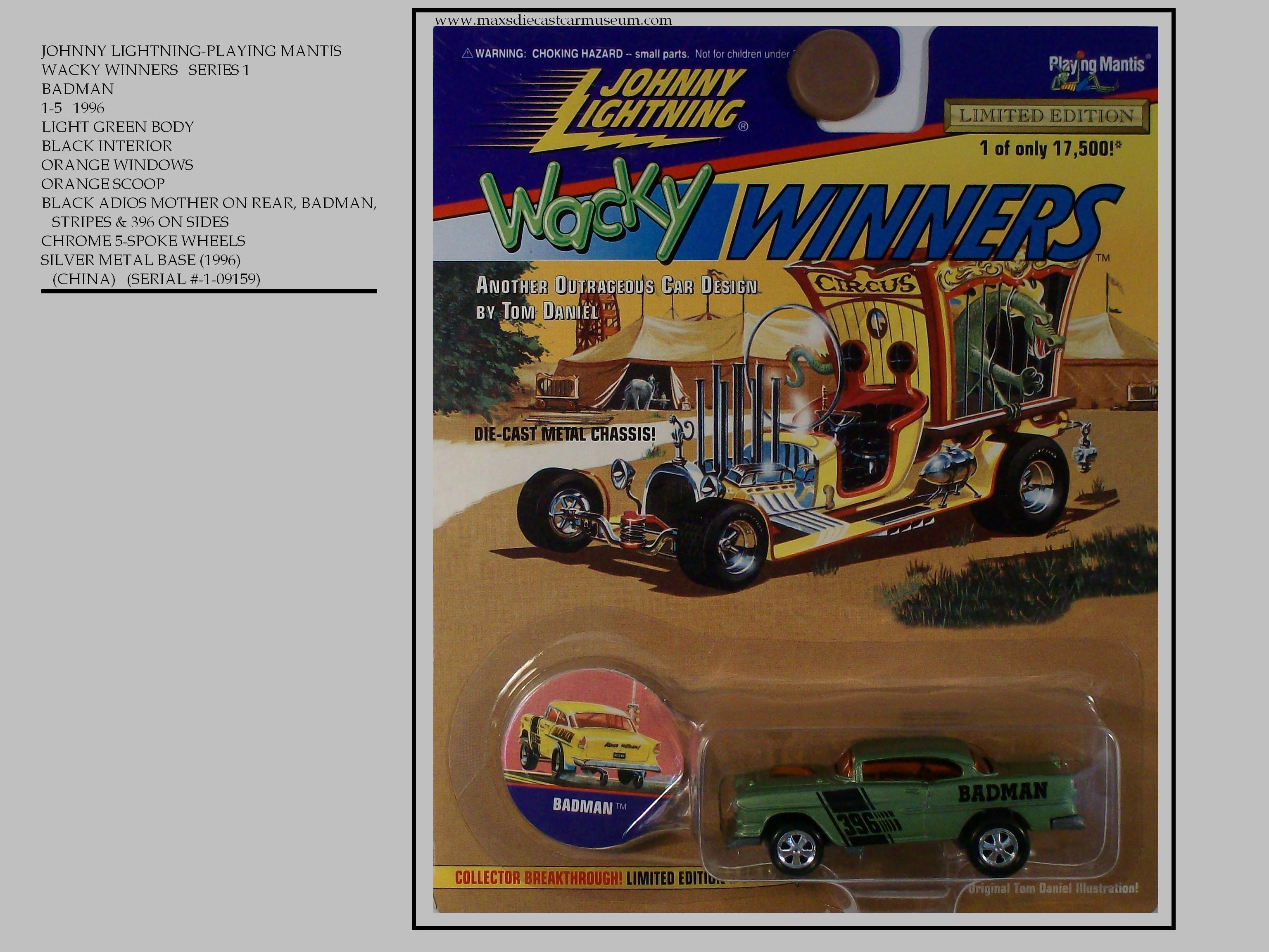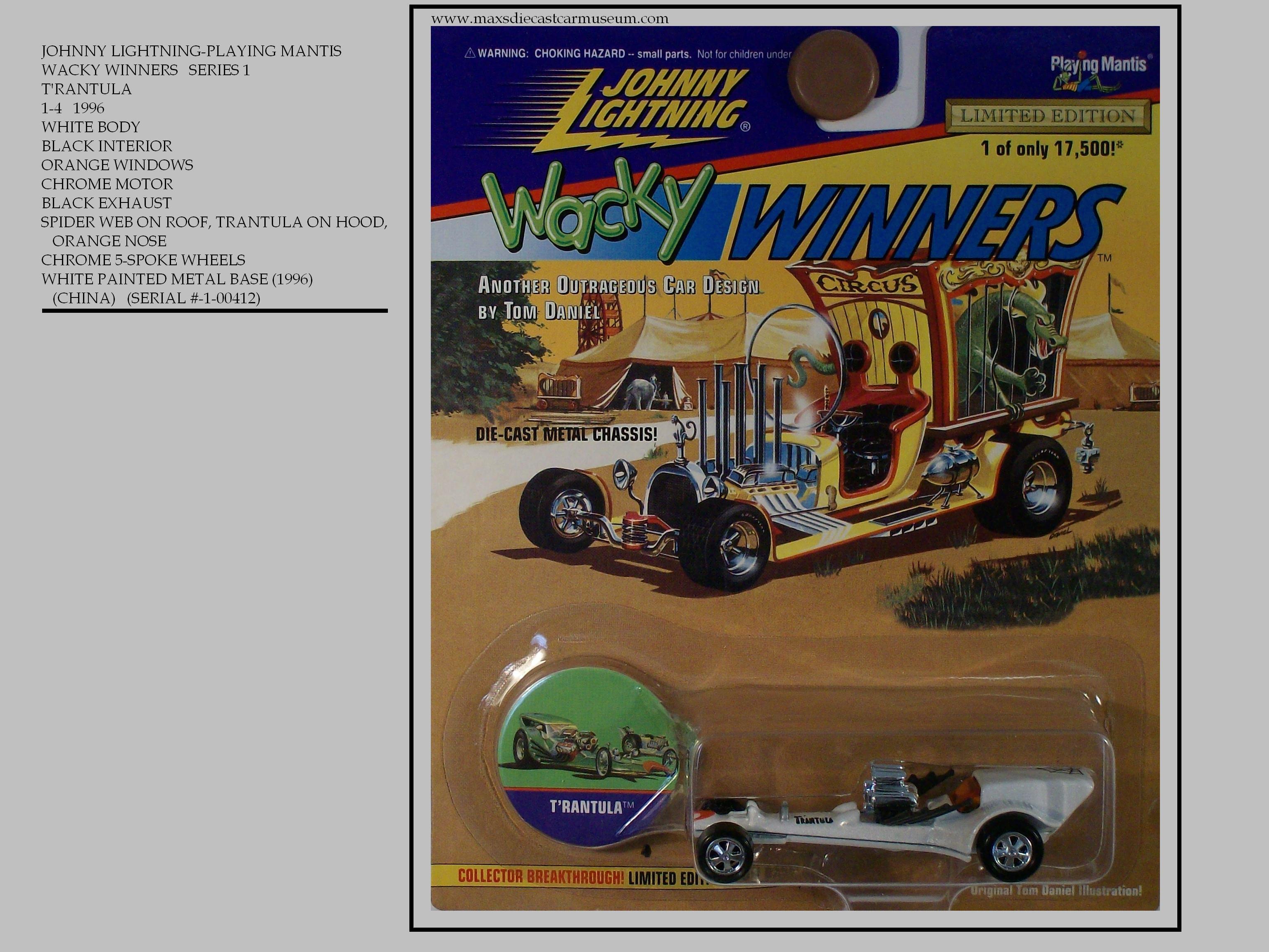 The 1996 release of the WACKY WINNERS series offered replications of Tom Daniel Model designs. Each series number offered color variations, Wheel variations and a change of card illustration.