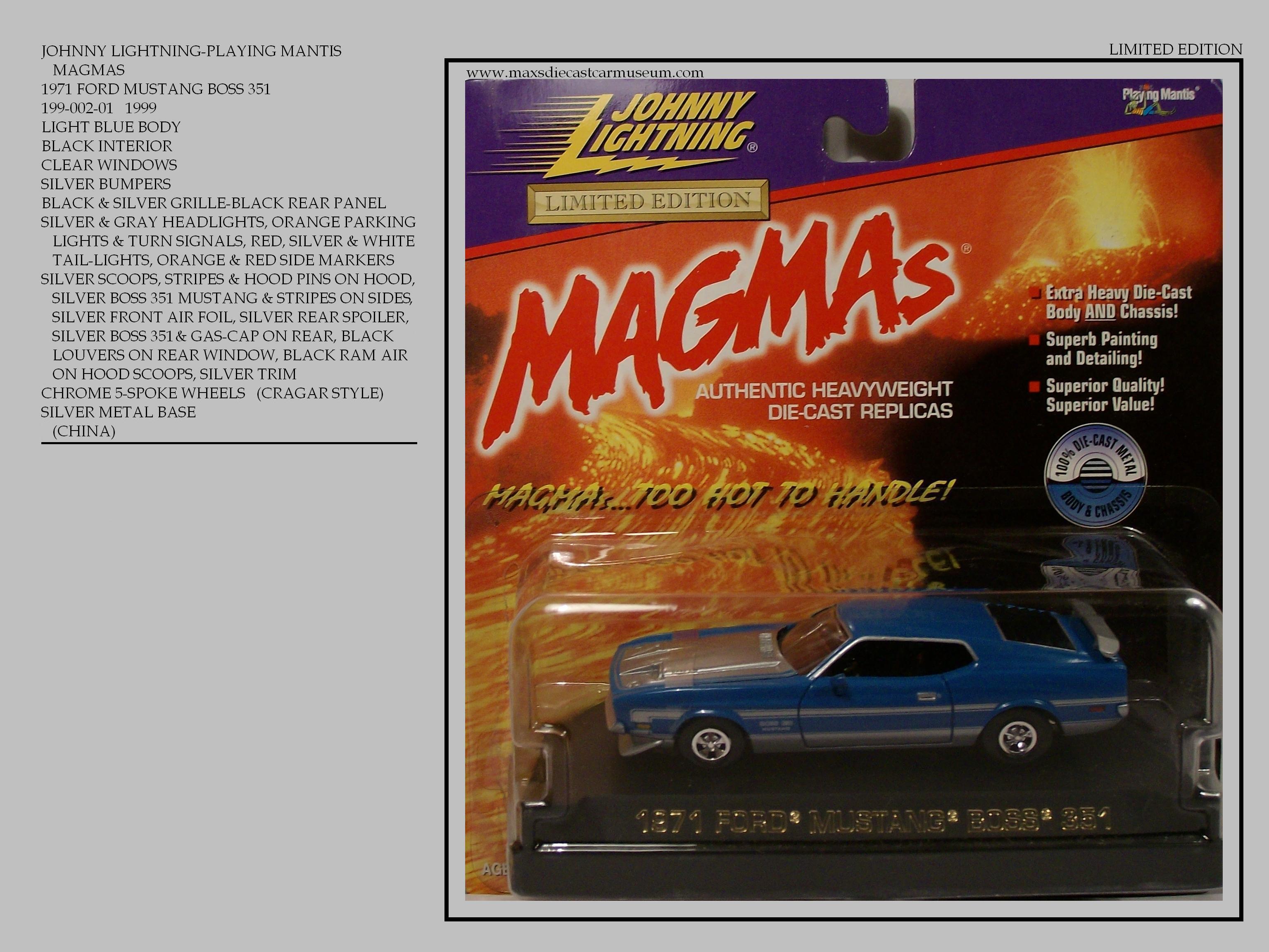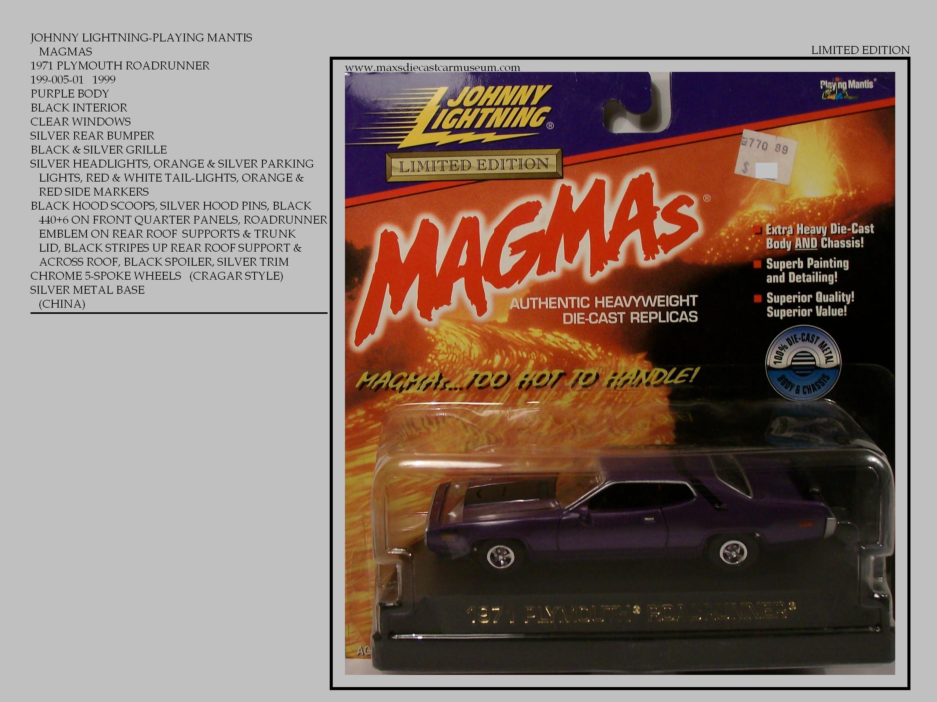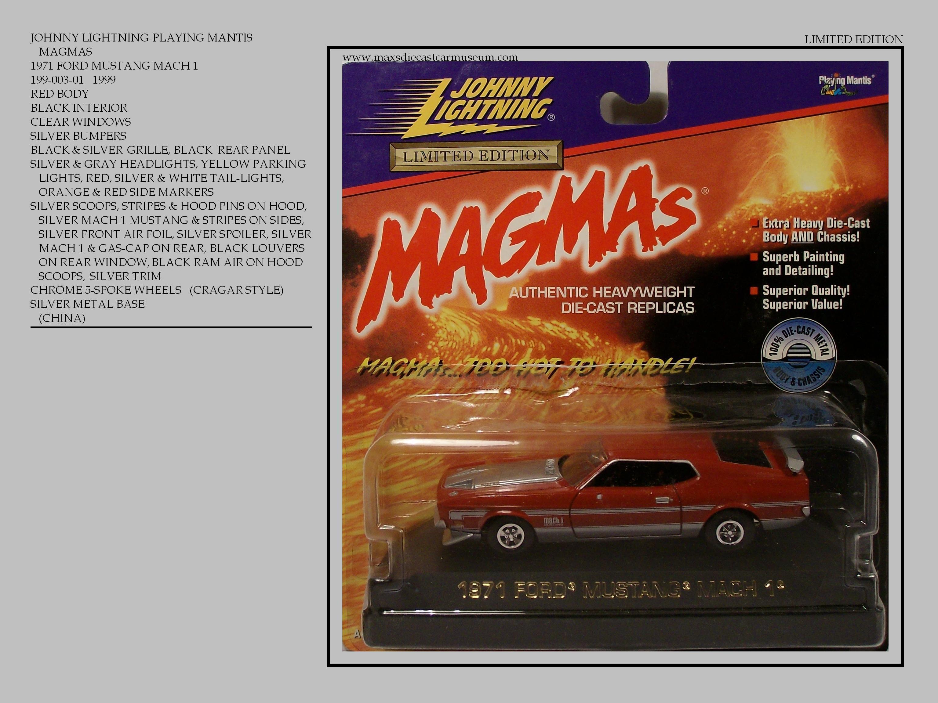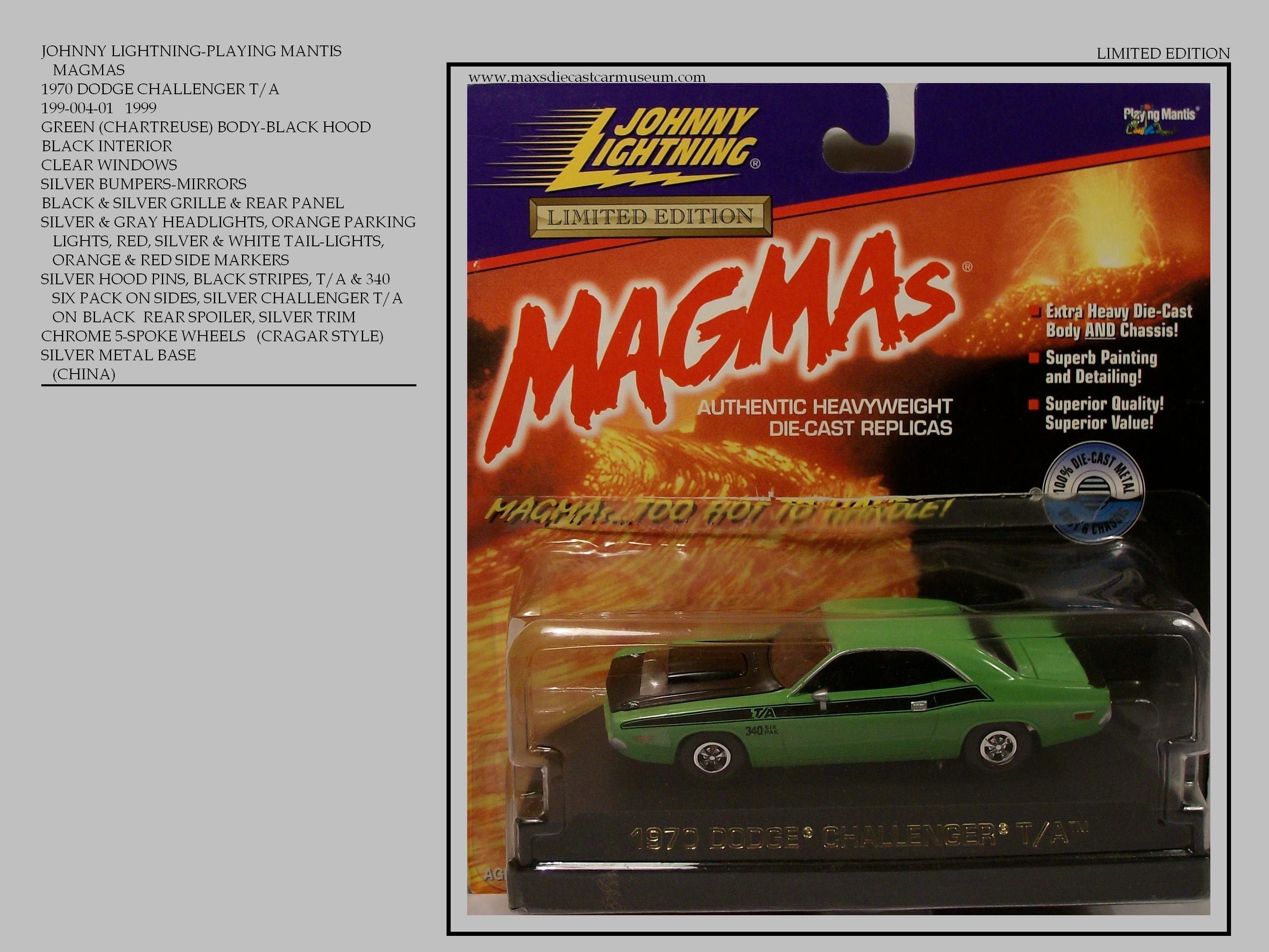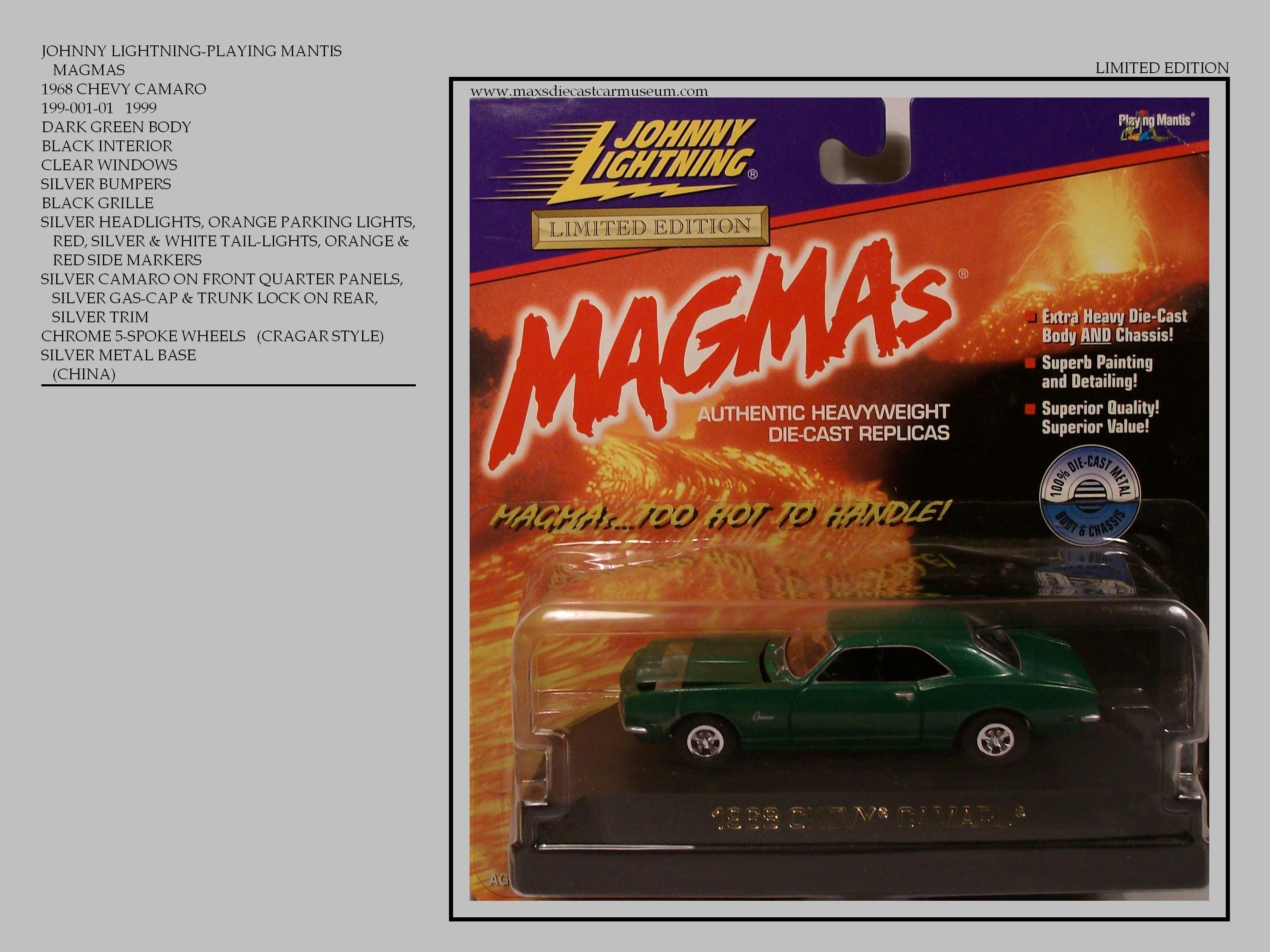 The Johnny Lightning MAGMAS are very detailed 1/43 scale models. As the card says these cars are very heavy for their size. They came with a display base with the car identification on the front of the base. Included on the rear of the card is a special Mail-In offer for a red 1968 Chevy Camaro, The only way you could purchase the car.