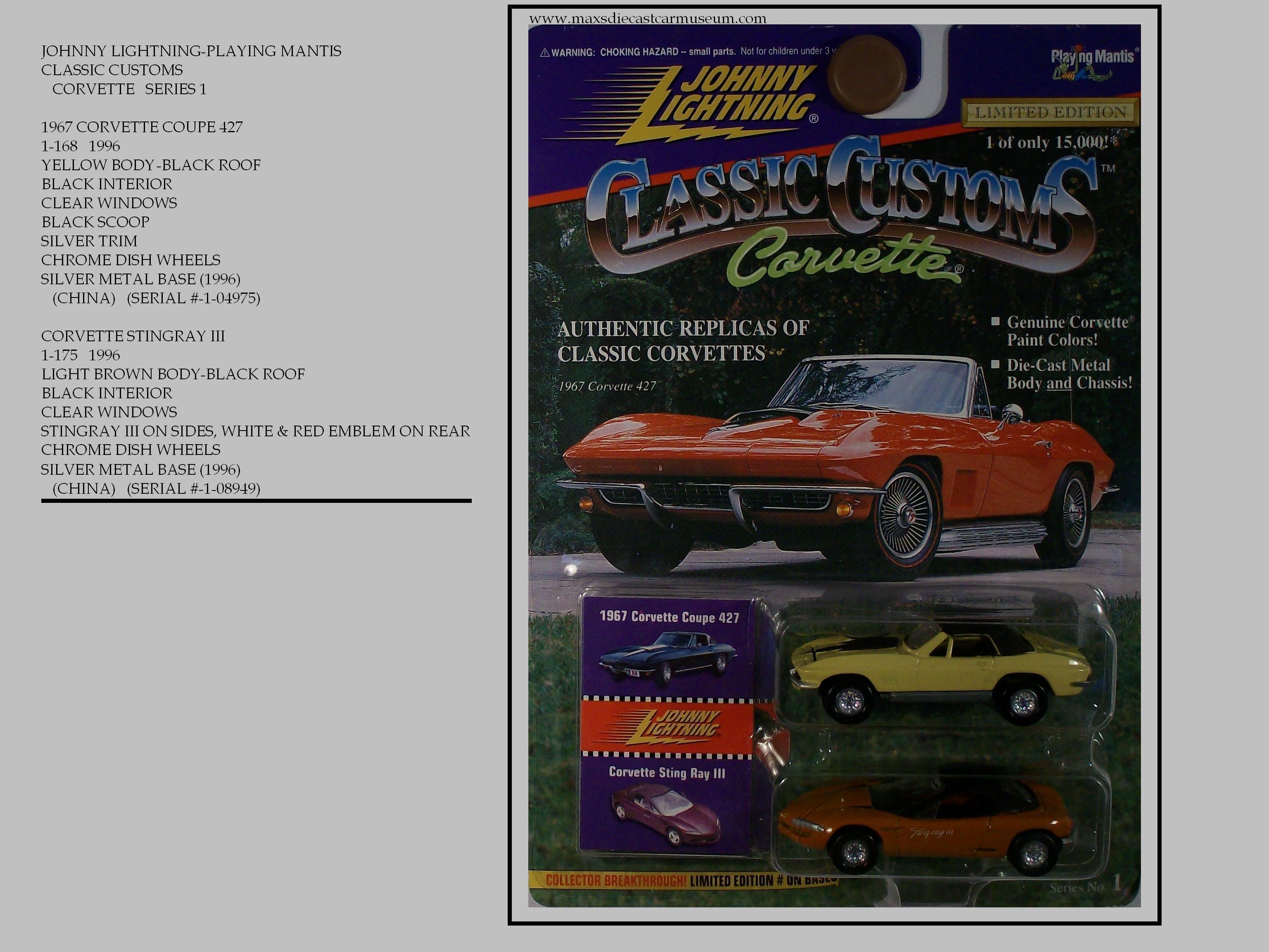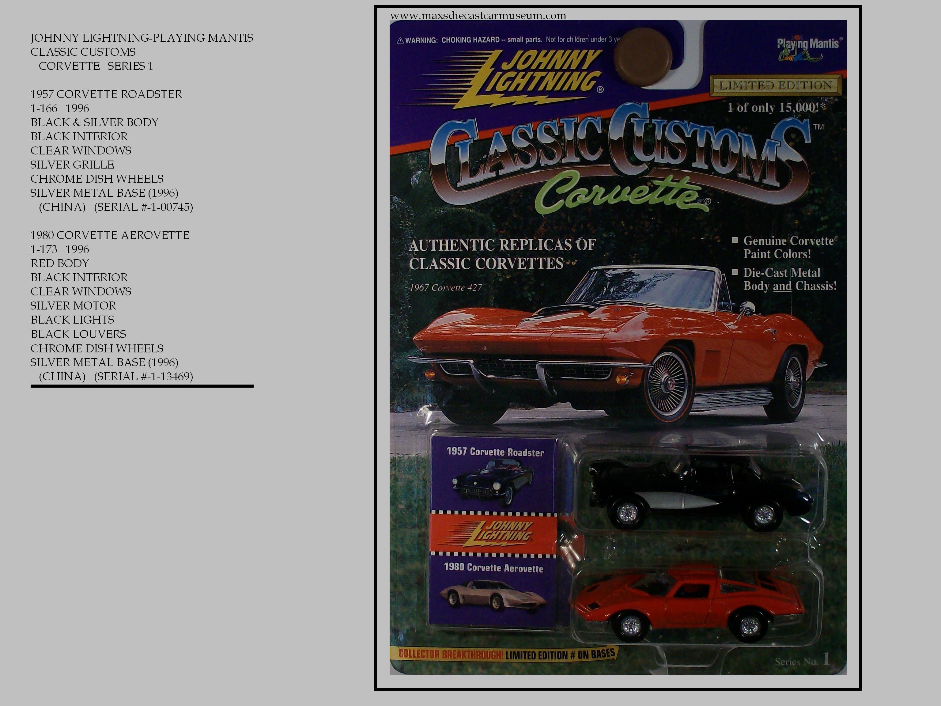 The Various Series Collection includes models from series where only a few models make up the series, Or the collection is short models in the series and does not justify it's own catagory. The Various Collection includes: Tour 96--Classic Custom Corvettes--Truckin America--Mustang Classics--Show Stoppers--Hot Rods--Show Rods--Super Chevy--Camaro Collection--Tri Chevy--Car Culture--True Grit--Lightning Speed--K.B. Toys--Modern Muscle--Surf Rods--British Invasion--Topper--Team Lightning--Hollywood on Wheels--Photodesign Art Cars--American Graffiti--Rebel Rods--Mooneyes--Thunderbird--Volkswagen--Retro Rods--Super 70s--Ragtops--Hot Rod Magazine--Chevy Thunder--Poker--Mustang & Fords--Camaro Legends--Mopar or no Car--Chevy High Performance--Head to Head--The Dukes of Hazzard--Rock Art--Pony Power--Johnny Retro--Muscle Cars--Working Class--60s Sizzle--Muscle Cars 1970--Wicked Wagons--The 1954 CORVETTE NOMAD is part of the two car pack: Classics Custom Corvette Series.