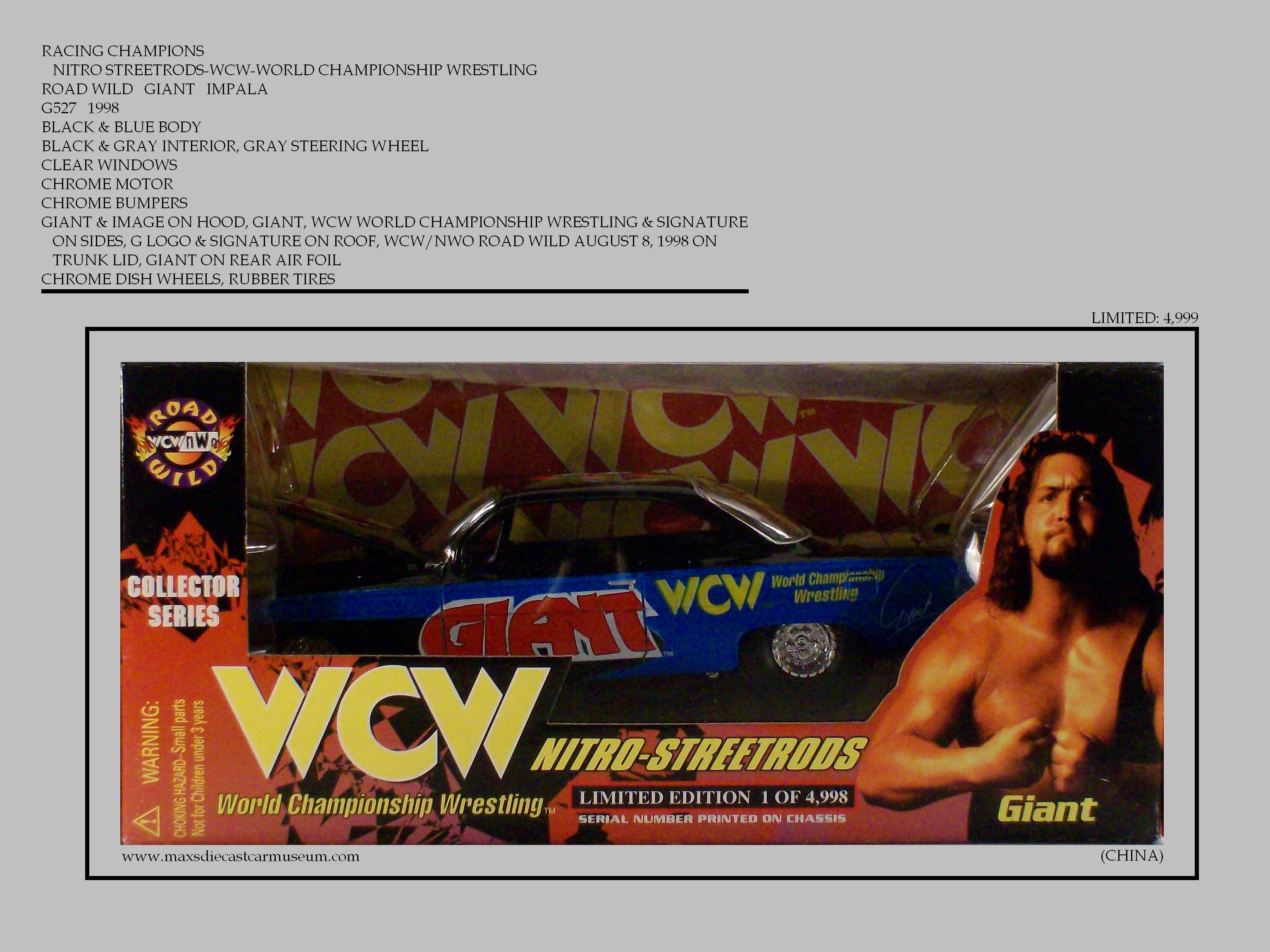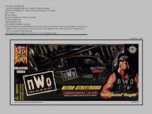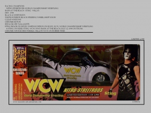 The NITRO STREETRODS 1/24 were produced in 1989 and 1999. All Limited Editions. Models depict WCW/NWO Wrestlers and Events. Many have signature boxes and wrestlers specs including height, weight and best move. All models have opening or removable hoods, Rubber tires, Detailed engines and undercarriages.