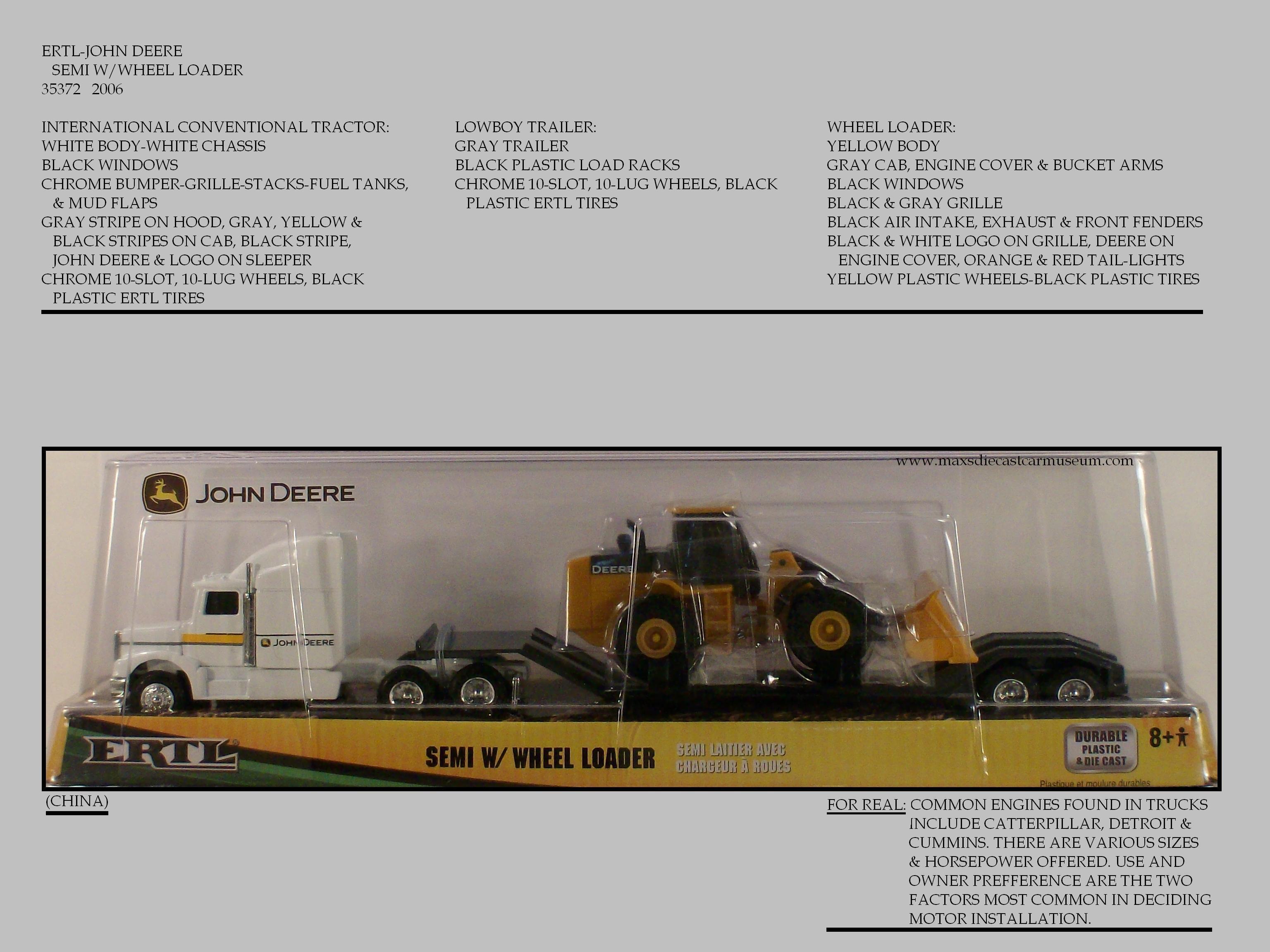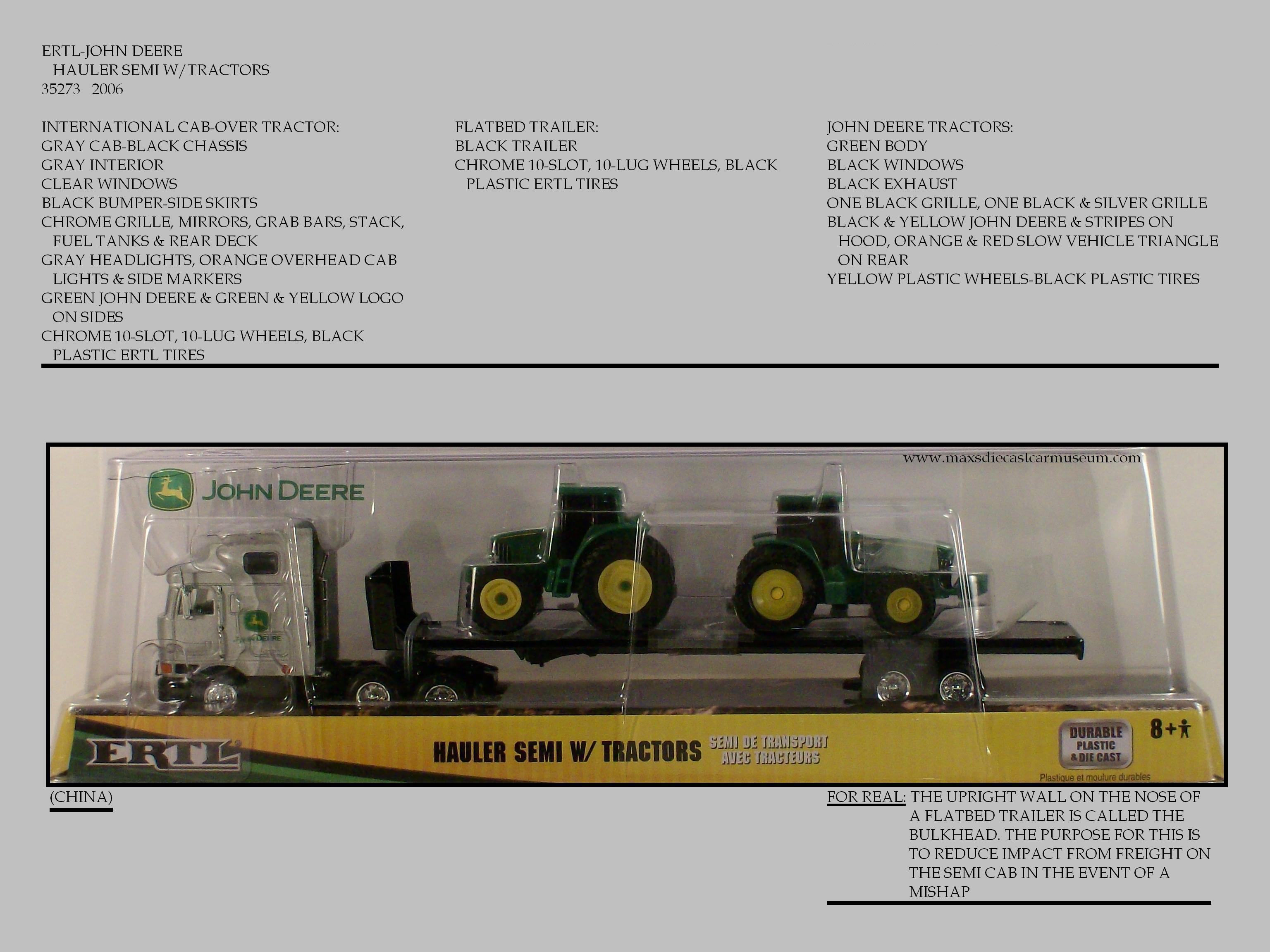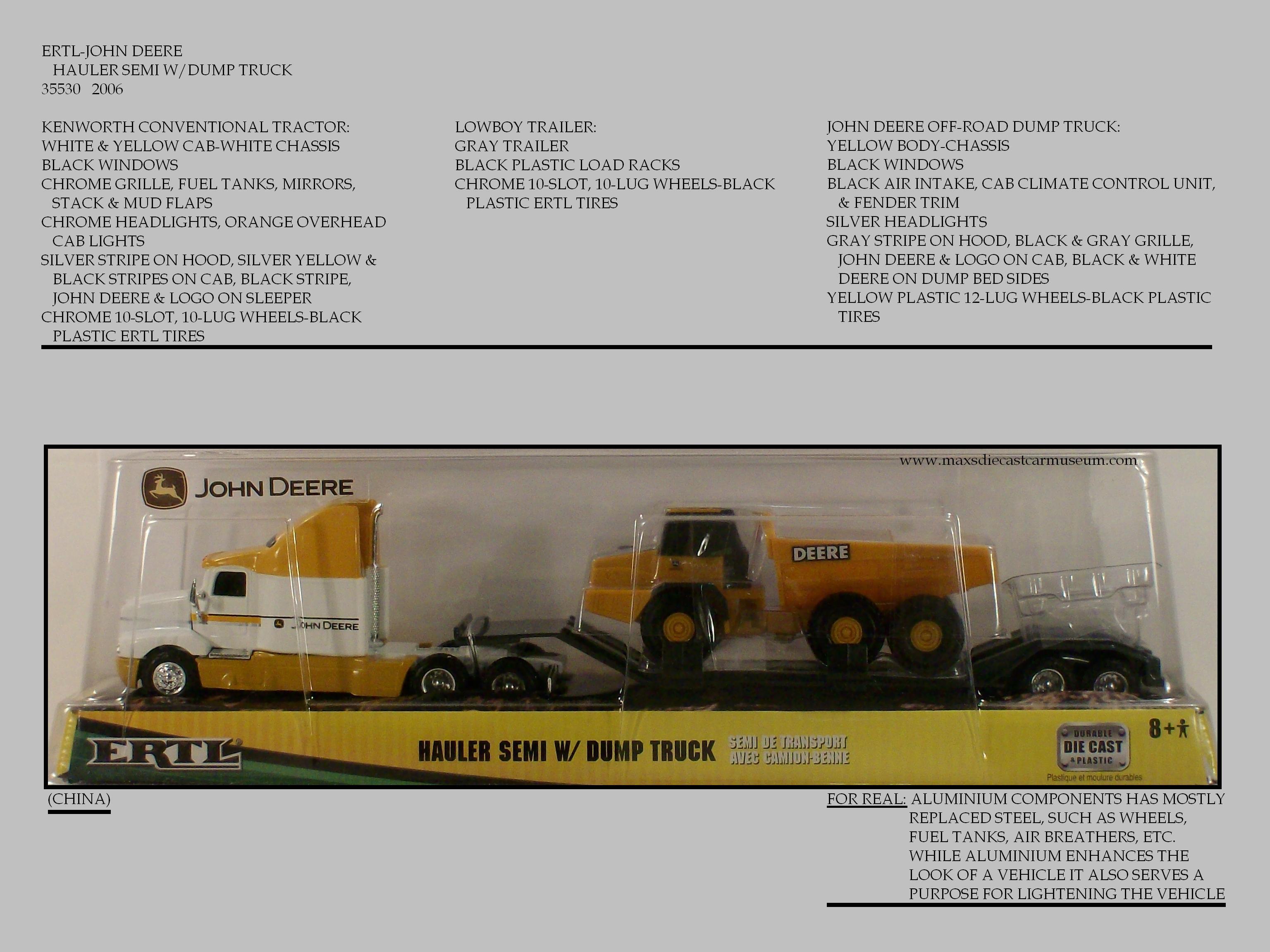 ROAD: Vehicles that move Equipment and Products over the road. Various vehicles necessary for various loads, Including Flat Beds, Low Boys, Sraight Trucks, Hoppers, Roll Backs and such, FARM: Equipment for farm use including various Tractors, Implements, Trailers, Harvesters and such, CONSTRUCTION: Front End Loaders, Articulating Dump Trucks, Backhoes, Graders and such, The collection includes a wide range of vehicles and equipment with few variations, Mostly Semi Cabs.